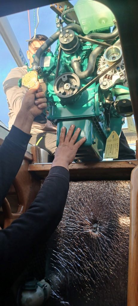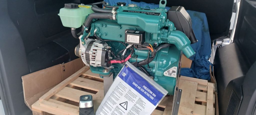 11/2025 – Motorwechsel – durch glücklichen Zufall sind wir an einen nagelneuen Volvo Penta D2-40 F Motor / Saildrive der letzten Generation mit Garantie gekommen, also Ausbau des alten Motors und Saildrives und Neueinbau. Erneuerung aller Kühlschläuche, Kabel, Getriebebowdenzug und Instrumente