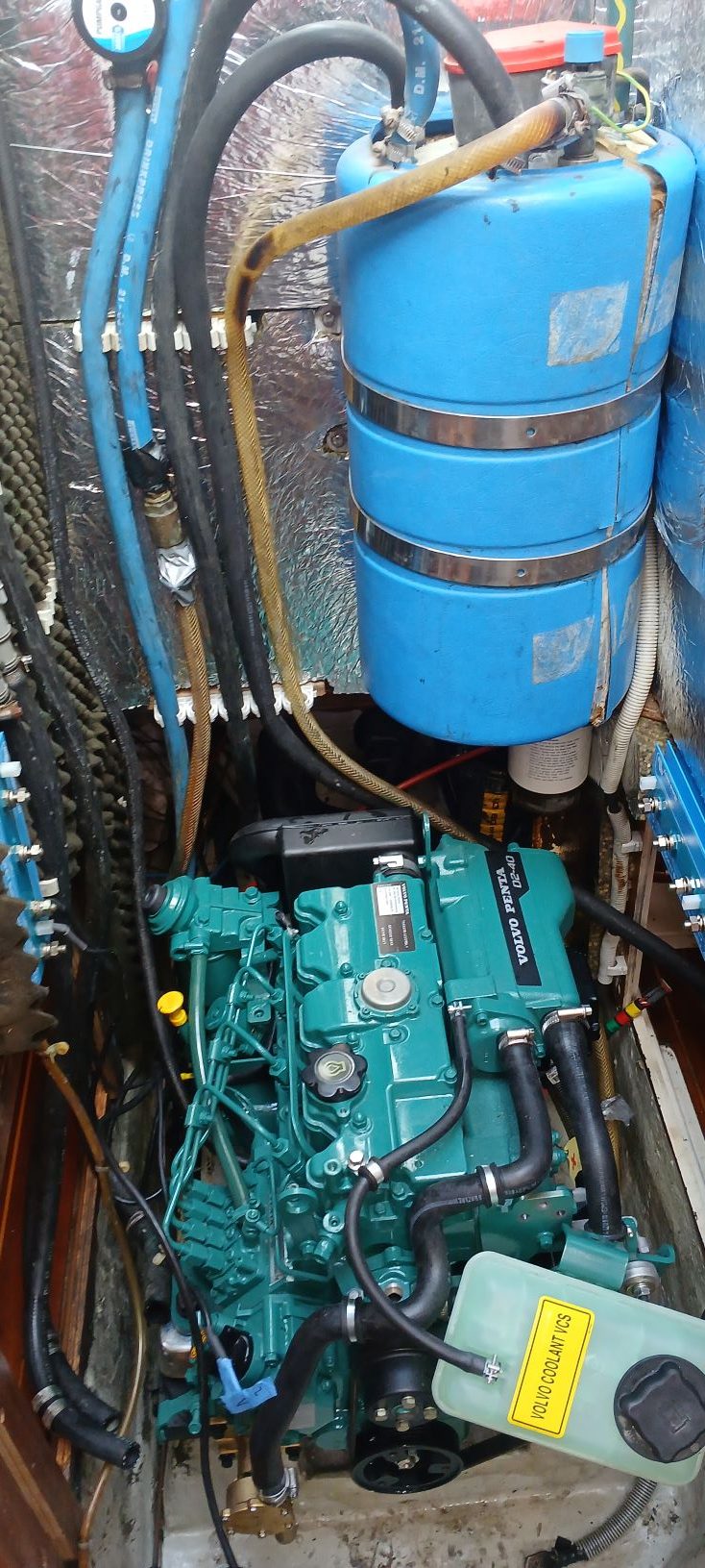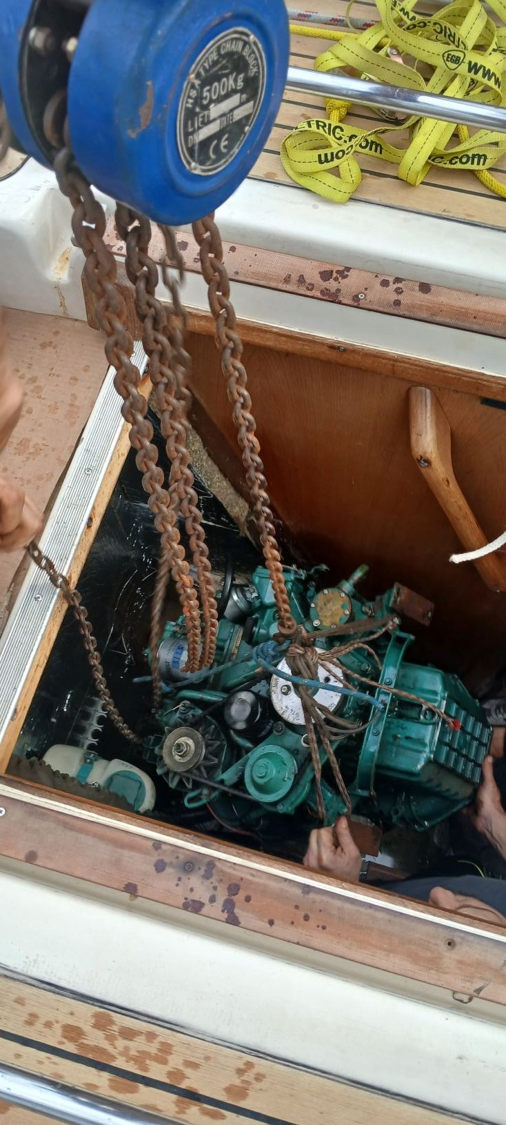 11/2025 – Motorwechsel – durch glücklichen Zufall sind wir an einen nagelneuen Volvo Penta D2-40 F Motor / Saildrive der letzten Generation mit Garantie gekommen, also Ausbau des alten Motors und Saildrives und Neueinbau. Erneuerung aller Kühlschläuche, Kabel, Getriebebowdenzug und Instrumente